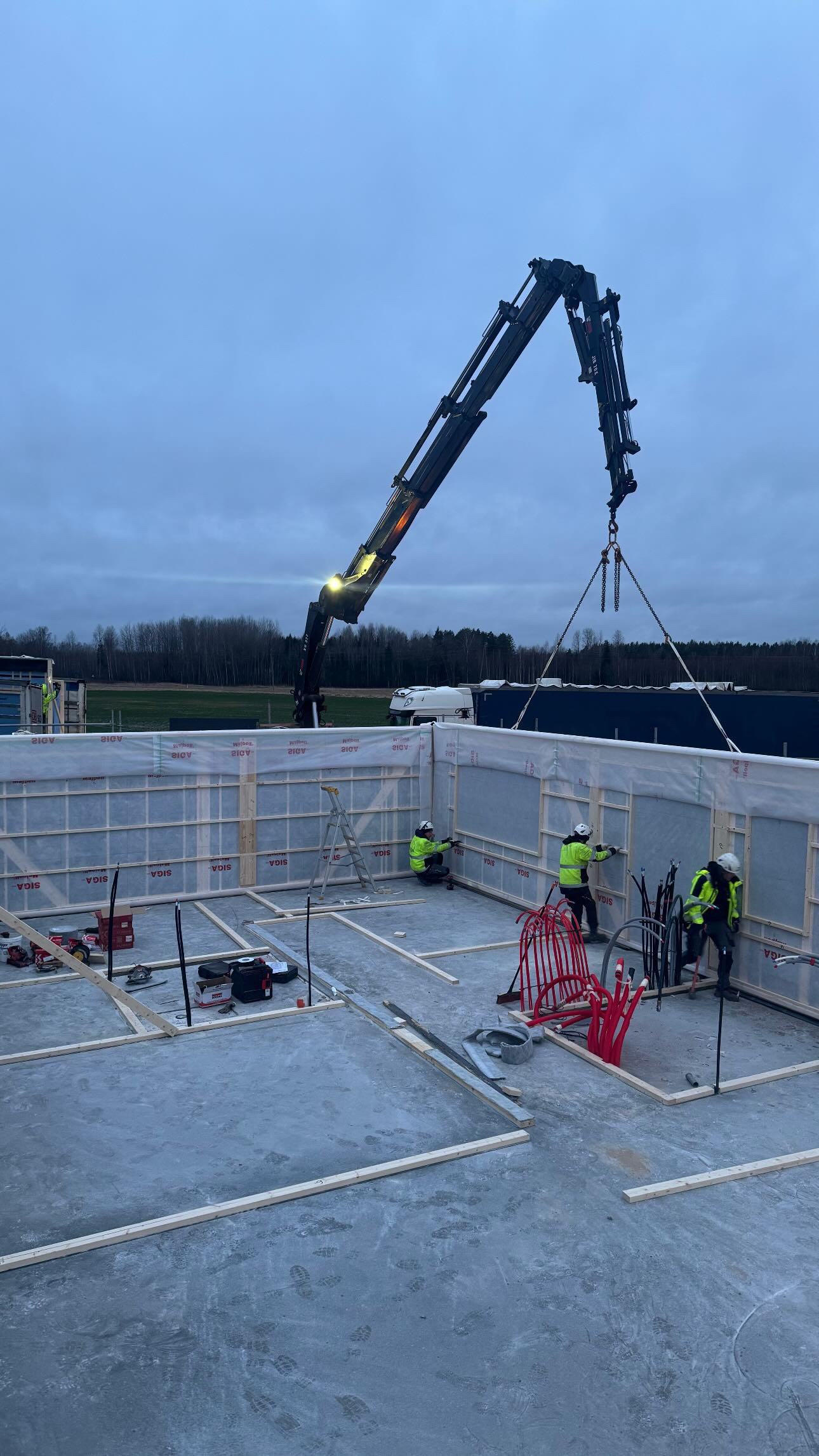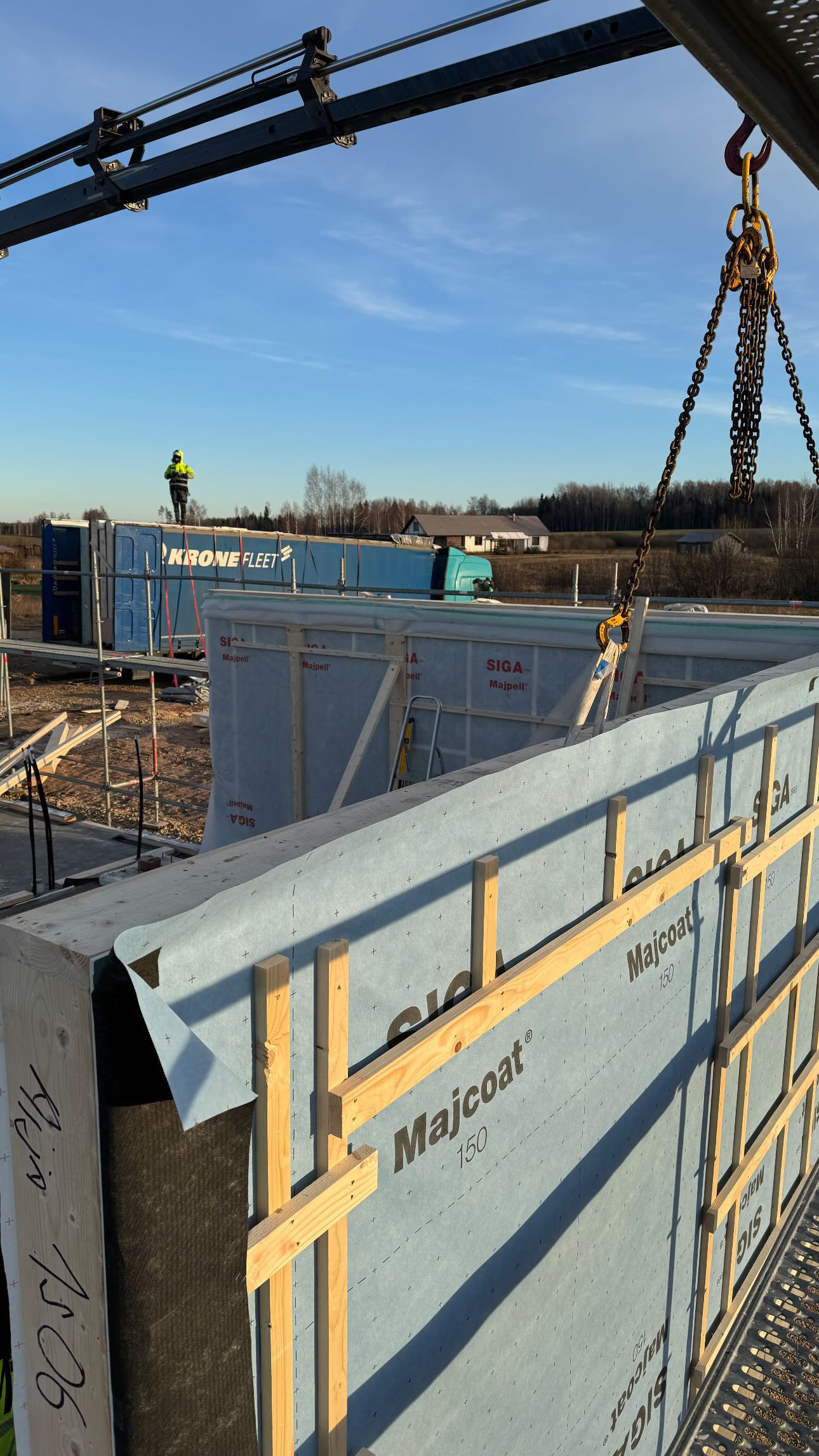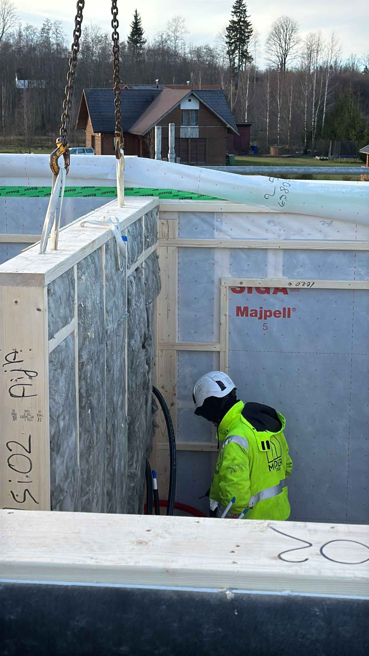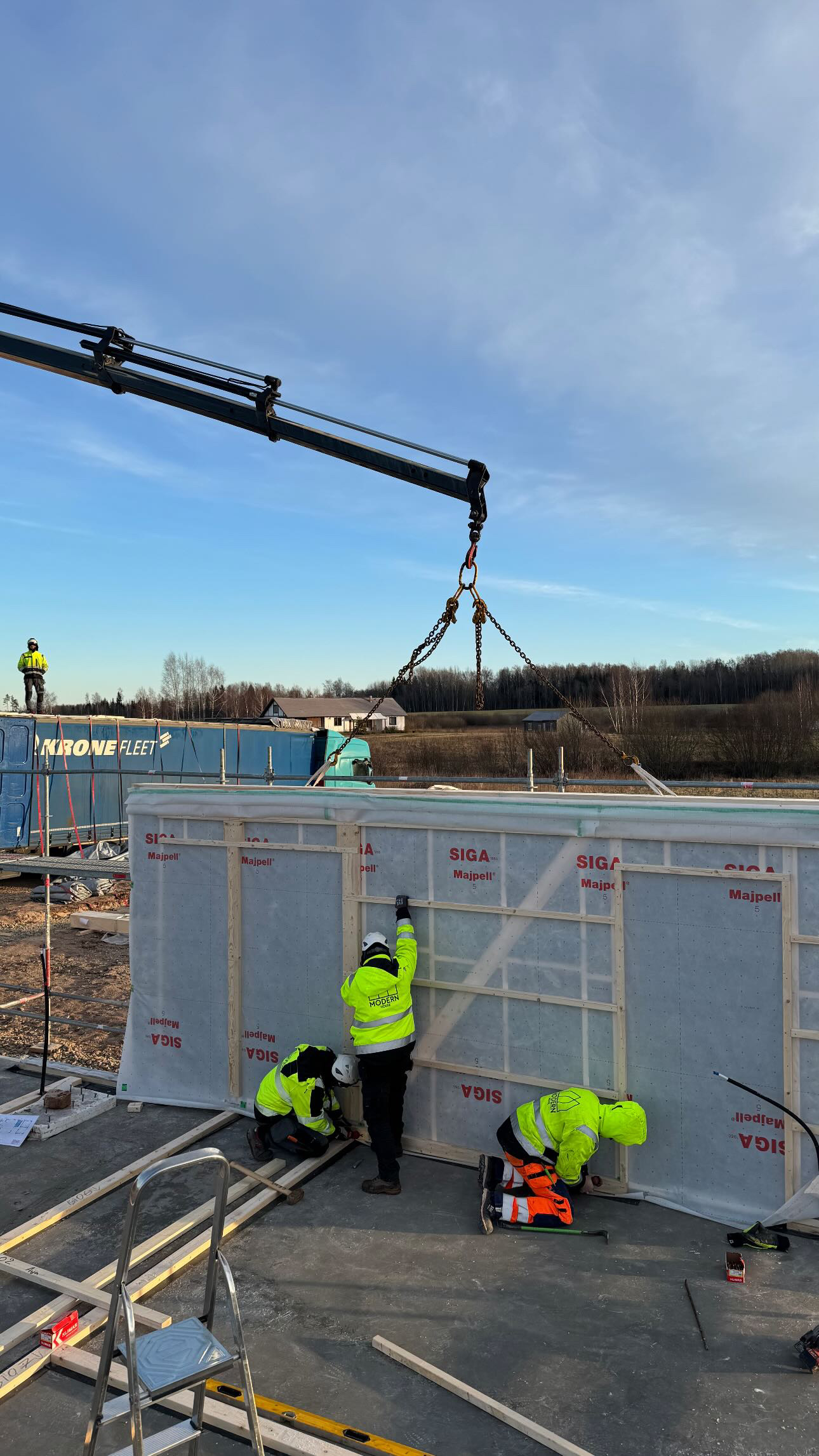 Privātmājas montāžas process sākas ar to, ka rūpnīcā precīzi izgatavotās konstrukcijas tiek transportētas uz būvlaukumu. Pēc to nogādāšanas speciālisti rūpīgi veic montāžas darbus, soli pa solim saliekot visas konstrukcijas, līdz tiek izveidota pilnībā pabeigta un dzīvošanai gatava ēka.