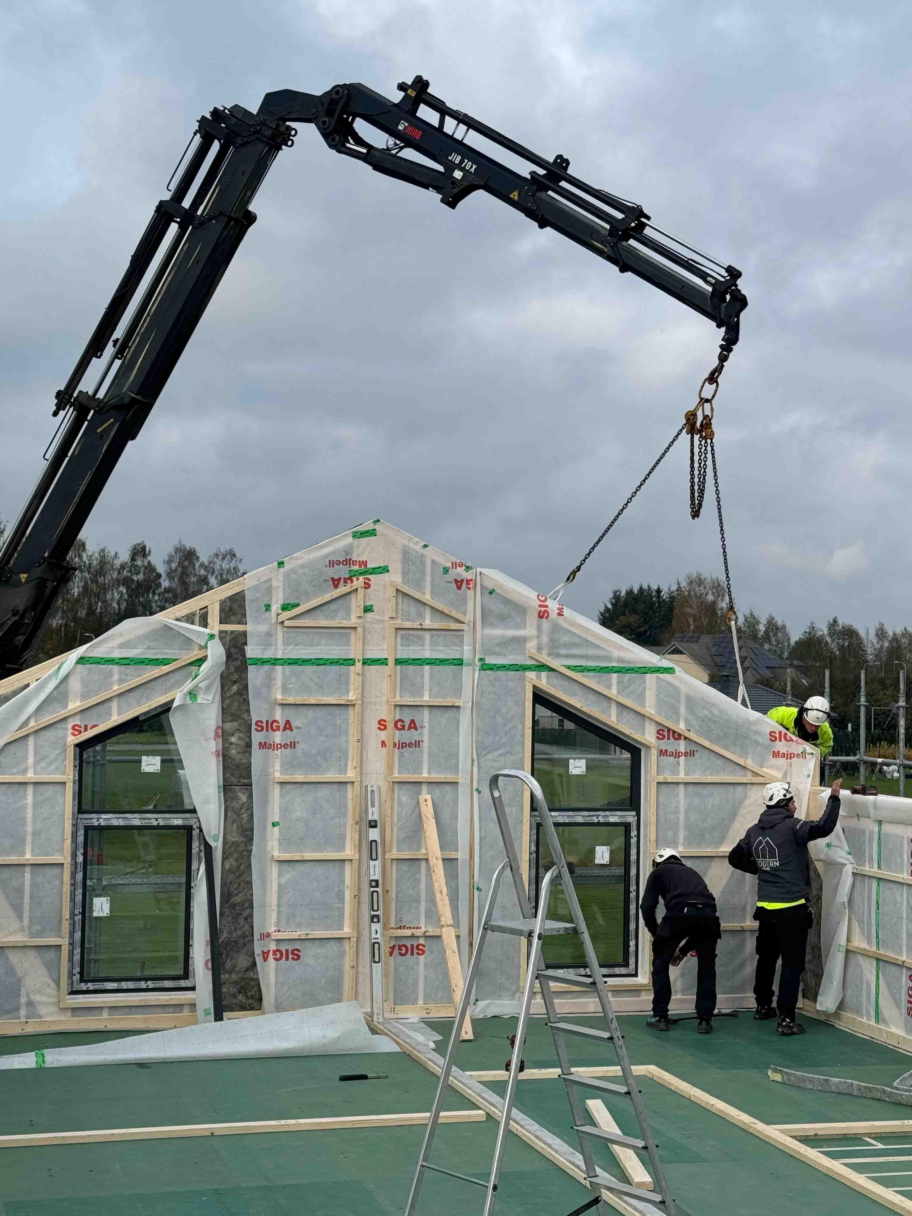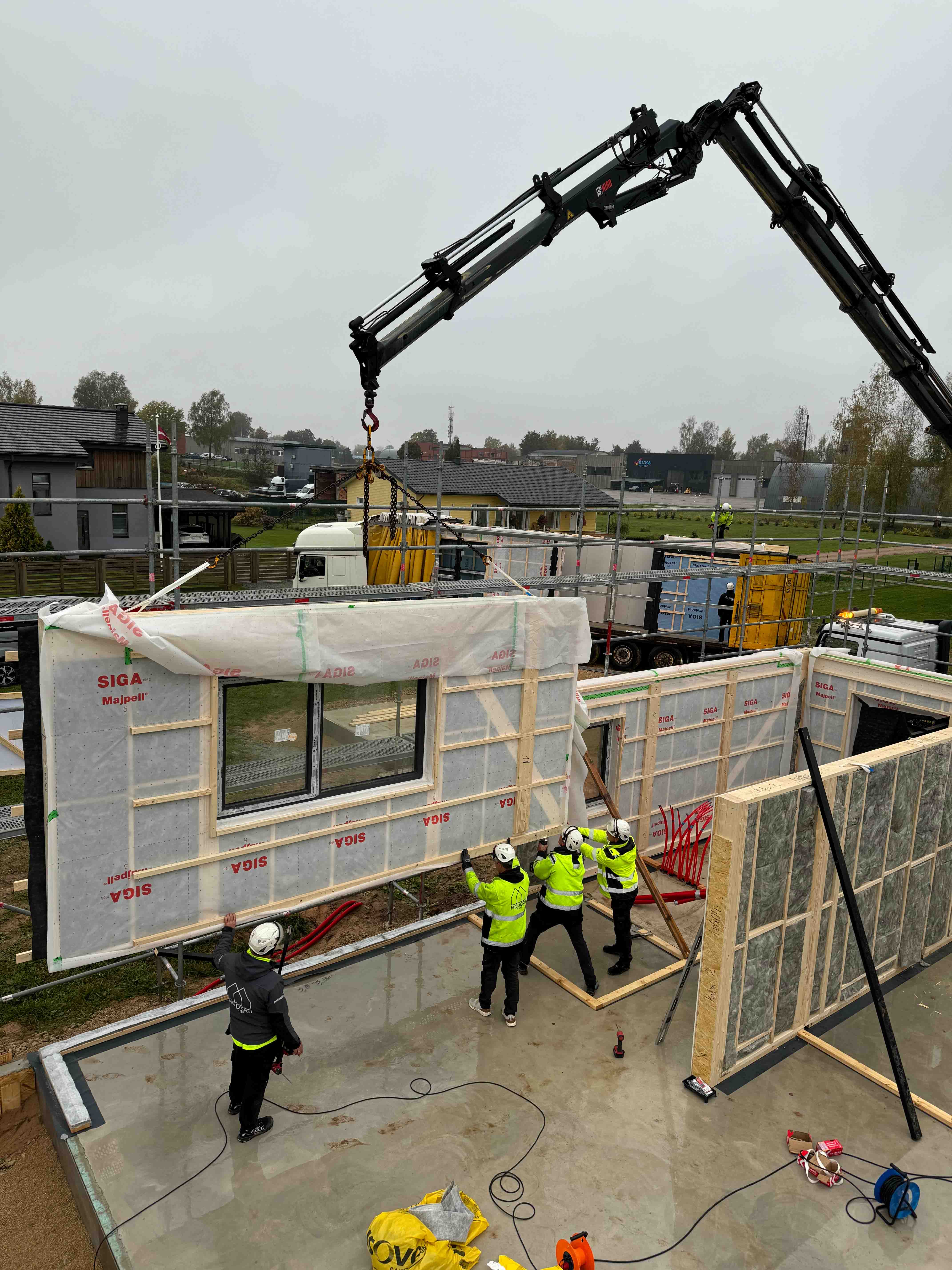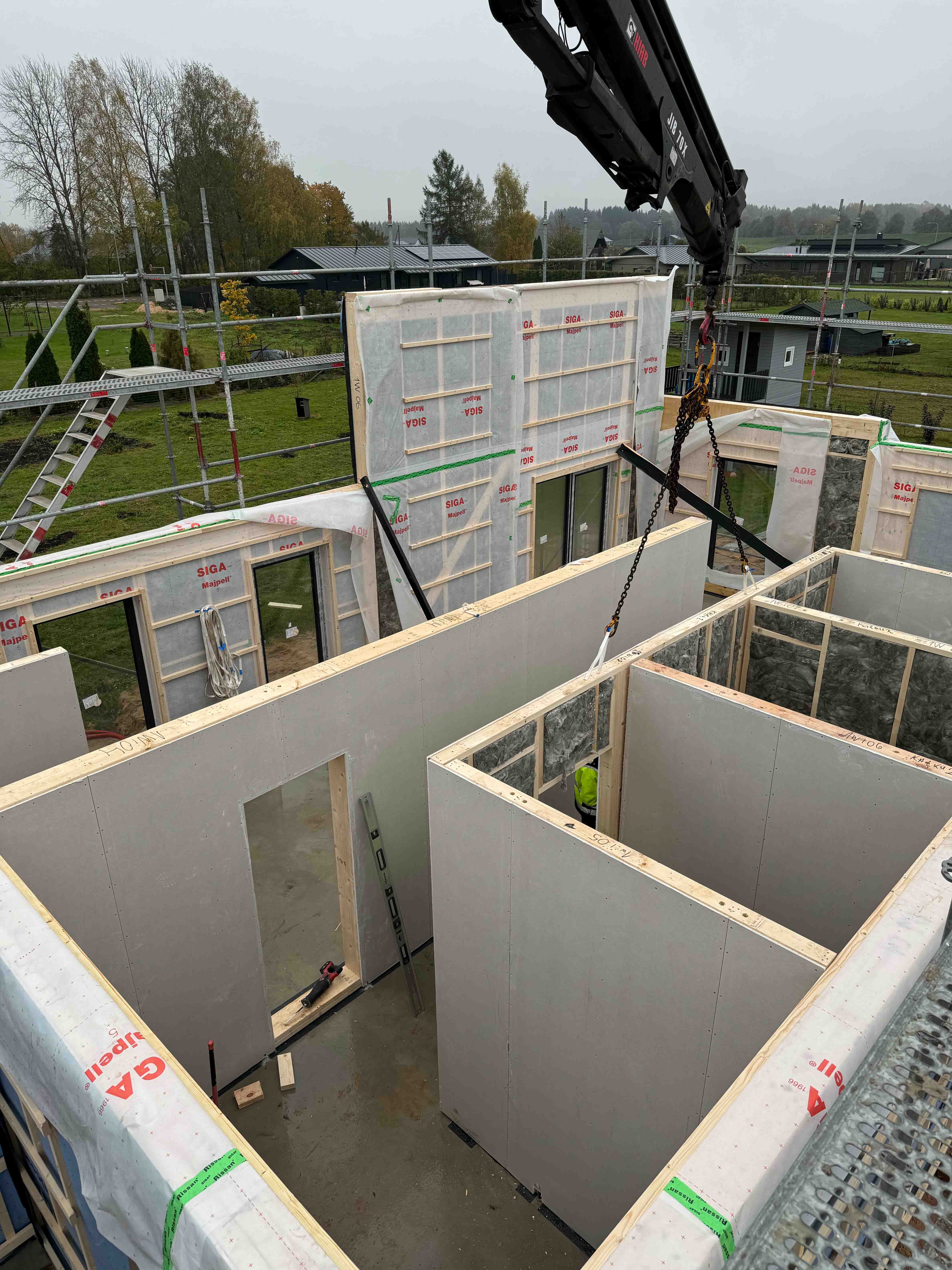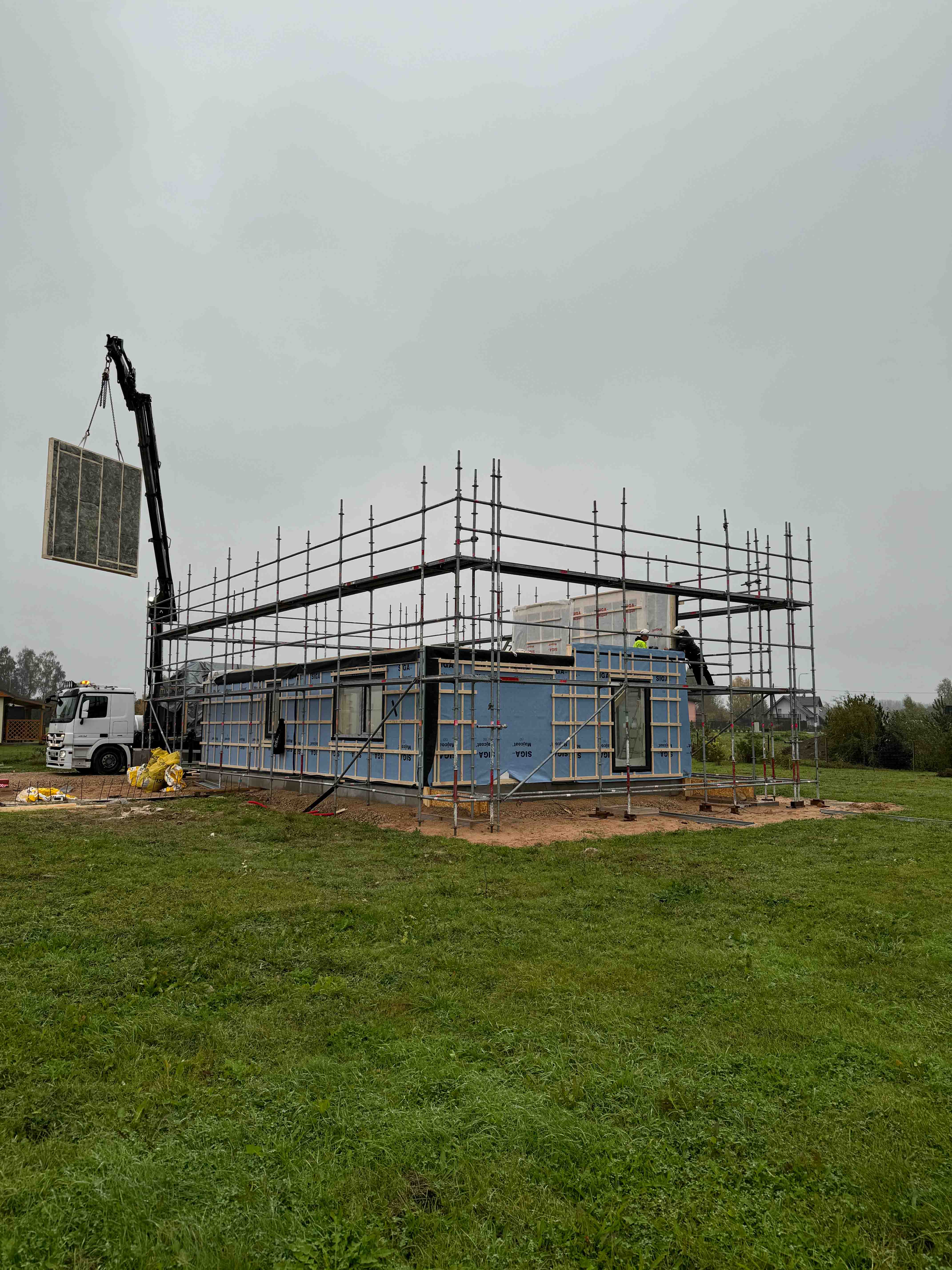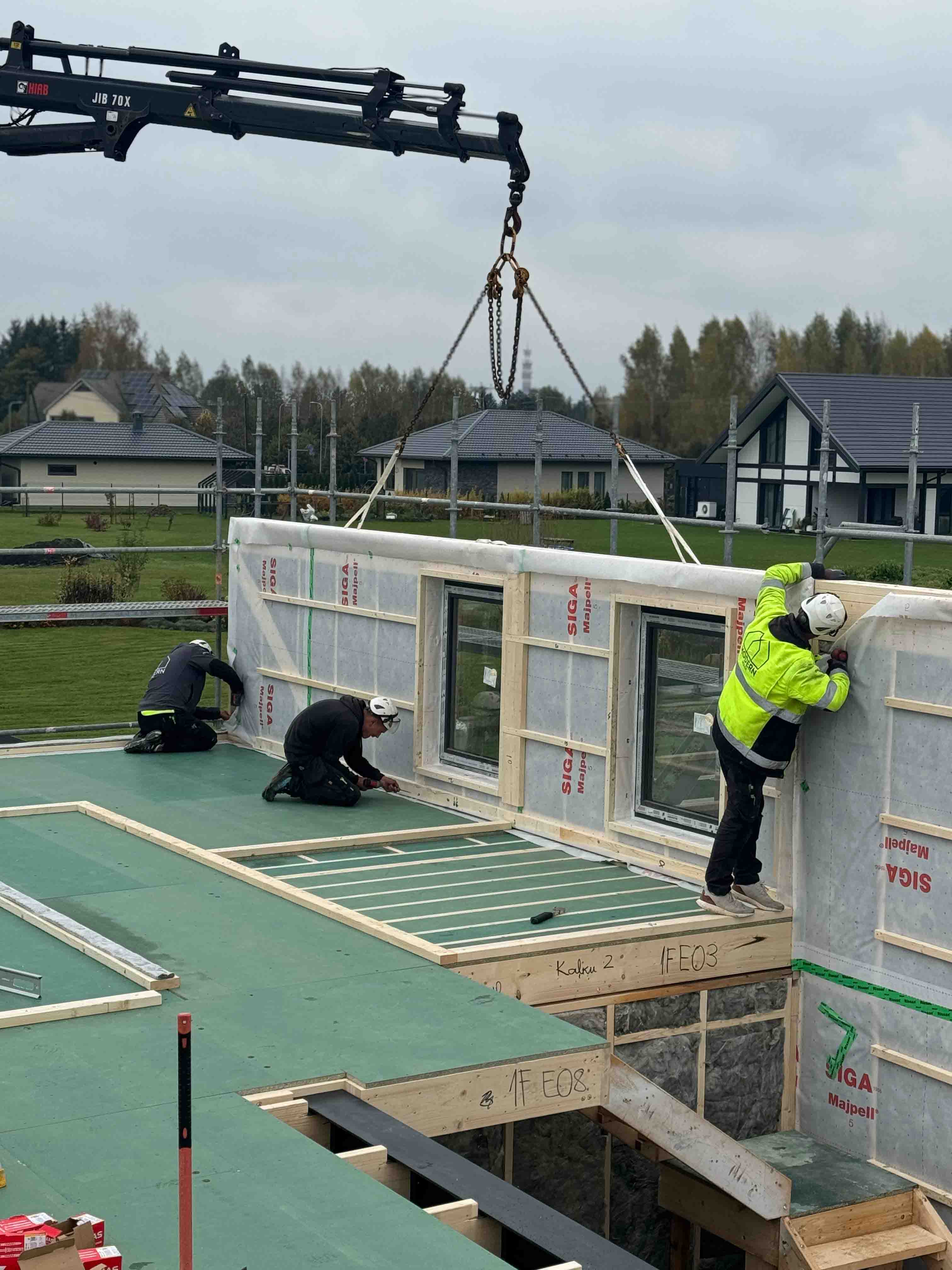 Mājas montāža objektā tiek veikta ātri un efektīvi, izmantojot rūpnīcā sagatavotas konstrukcijas, kas tiek montētas uz vietas ar augstākās kvalitātes materiāliem, nodrošinot stabilitāti, energoefektivitāti un precīzu rezultātu.
