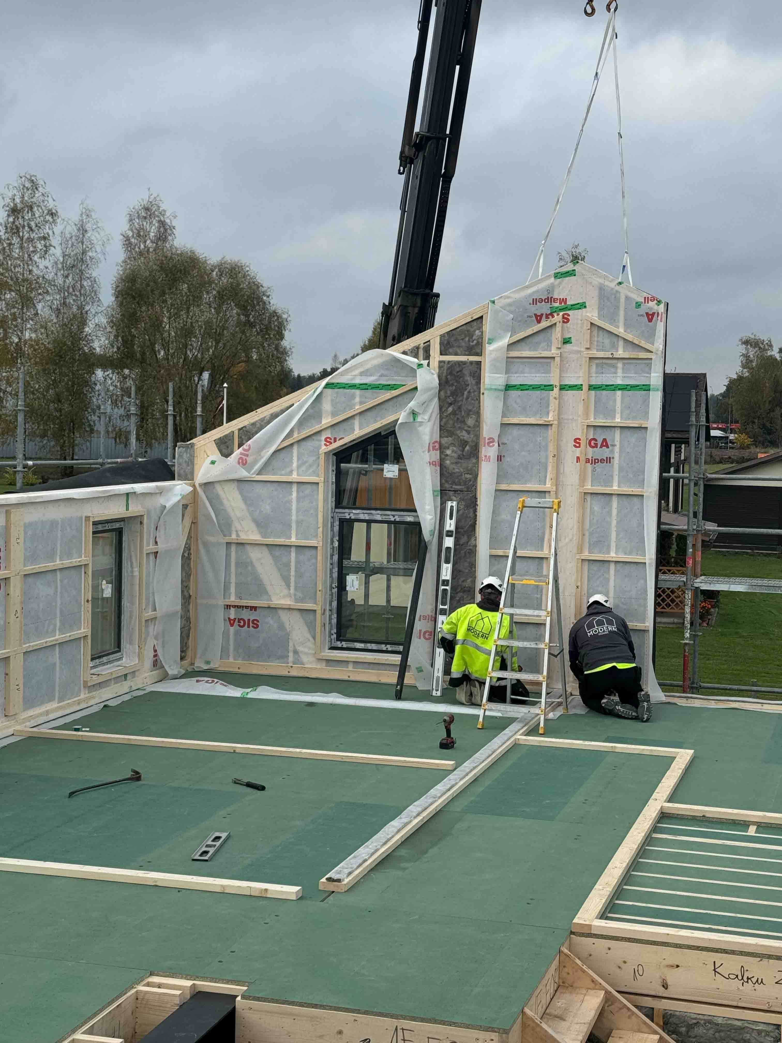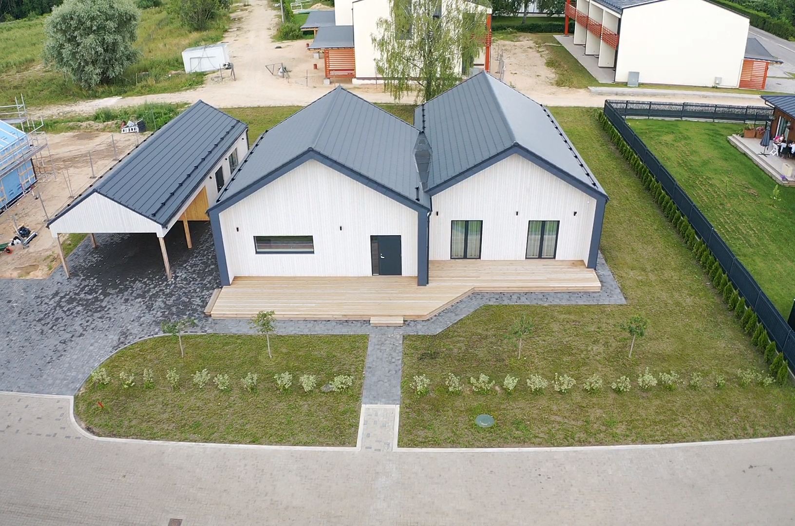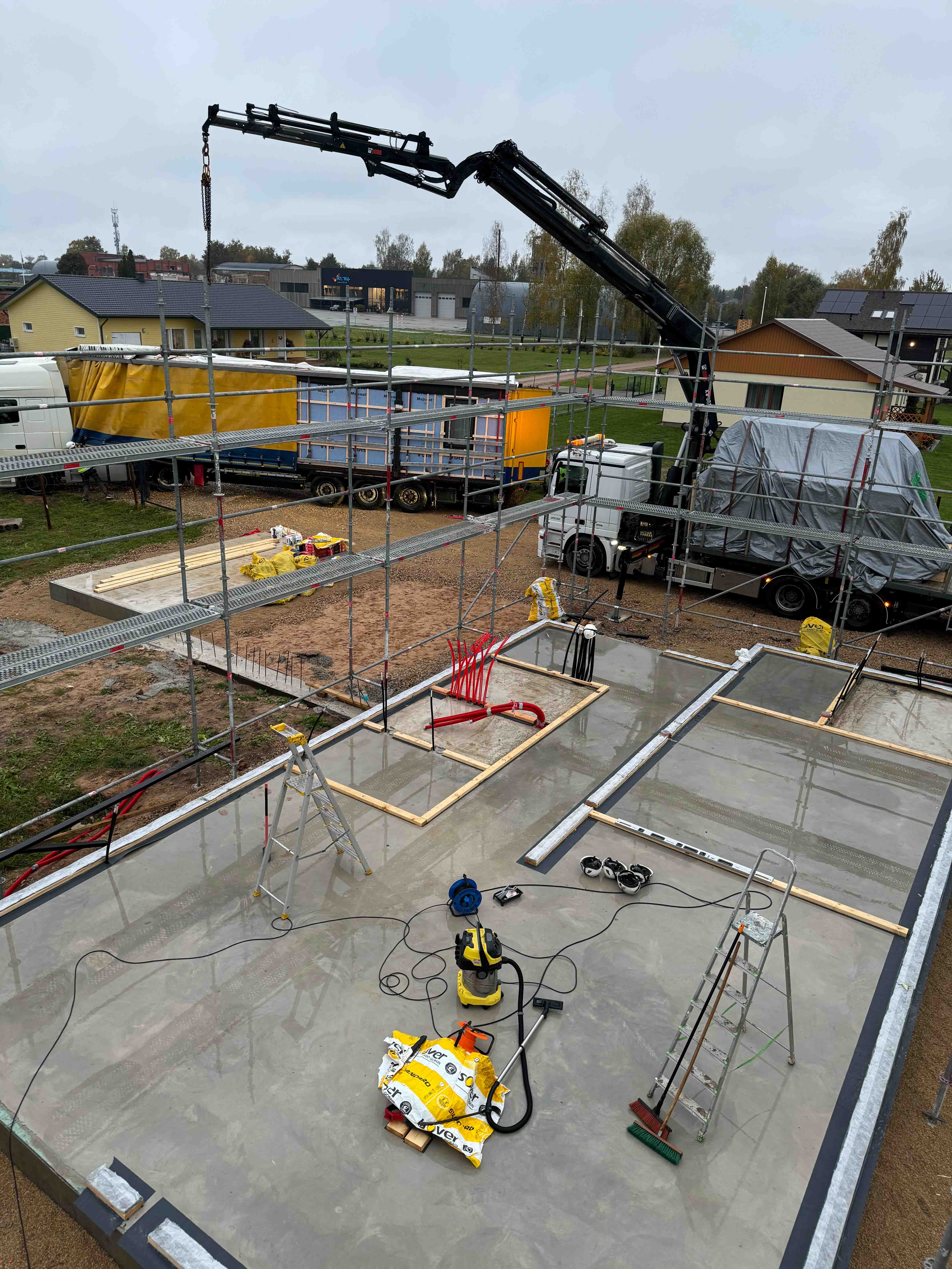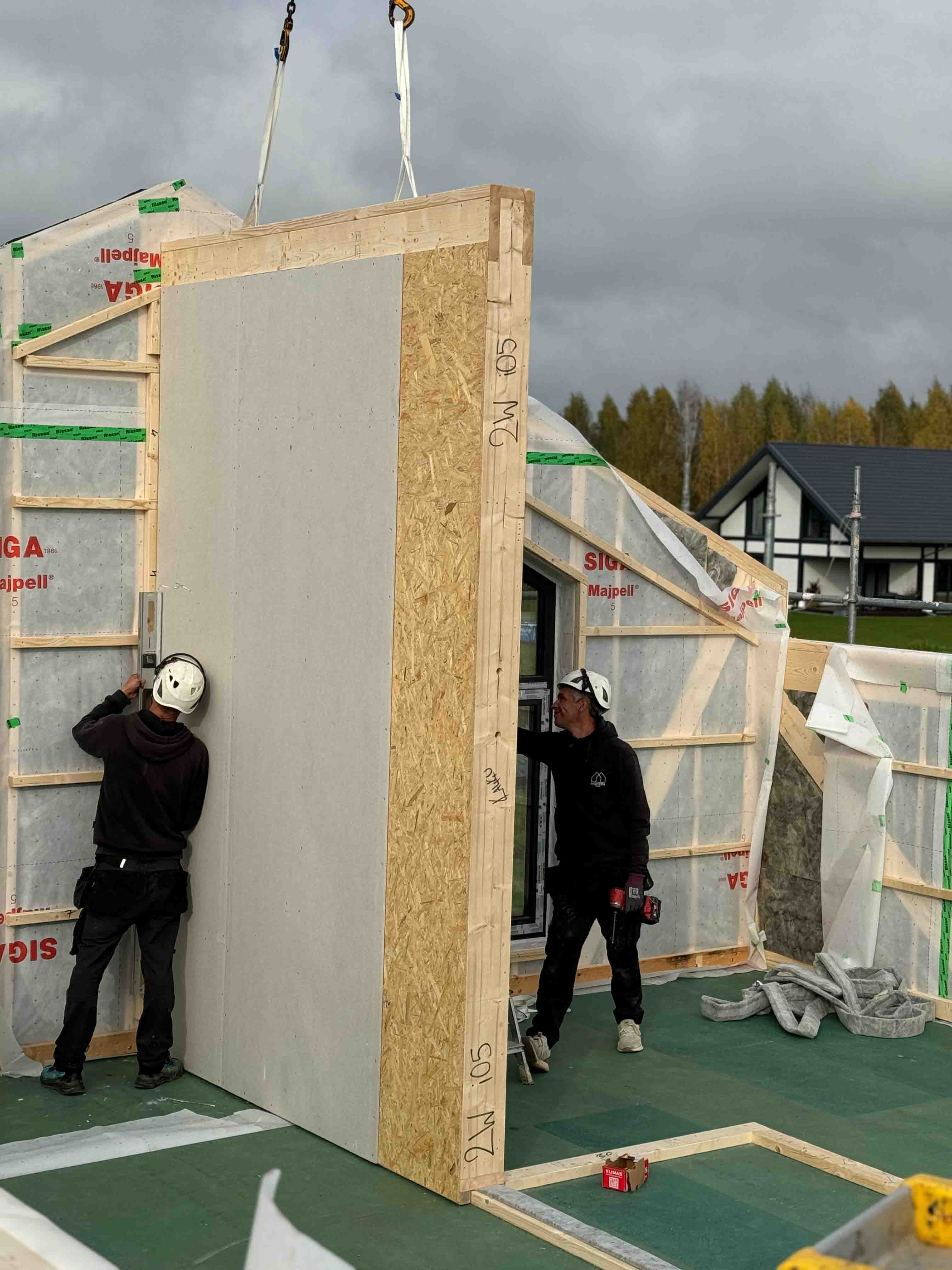 Mājas montāža objektā tiek veikta ātri un efektīvi, izmantojot rūpnīcā sagatavotas konstrukcijas, kas tiek montētas uz vietas ar augstākās kvalitātes materiāliem, nodrošinot stabilitāti, energoefektivitāti un precīzu rezultātu.