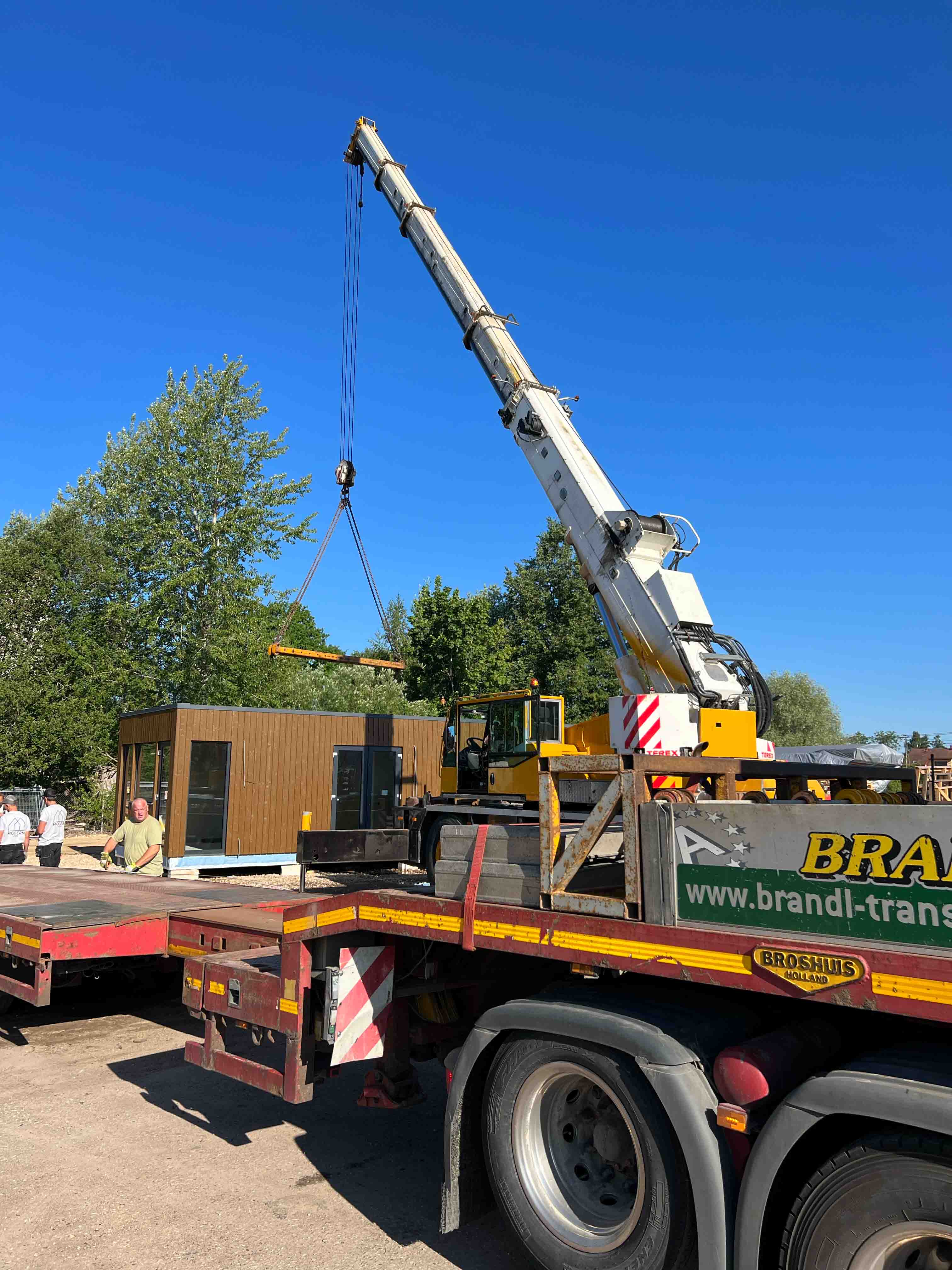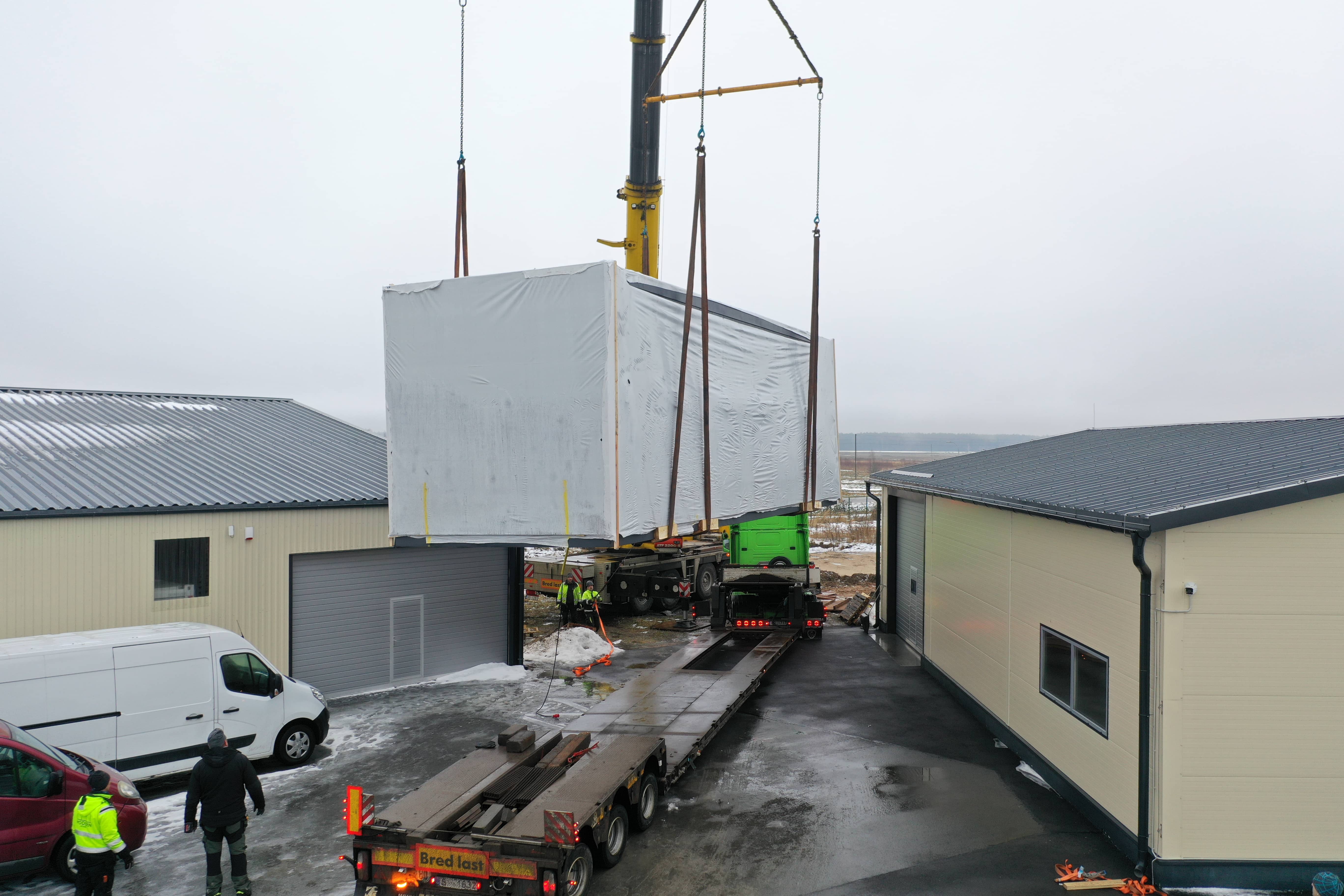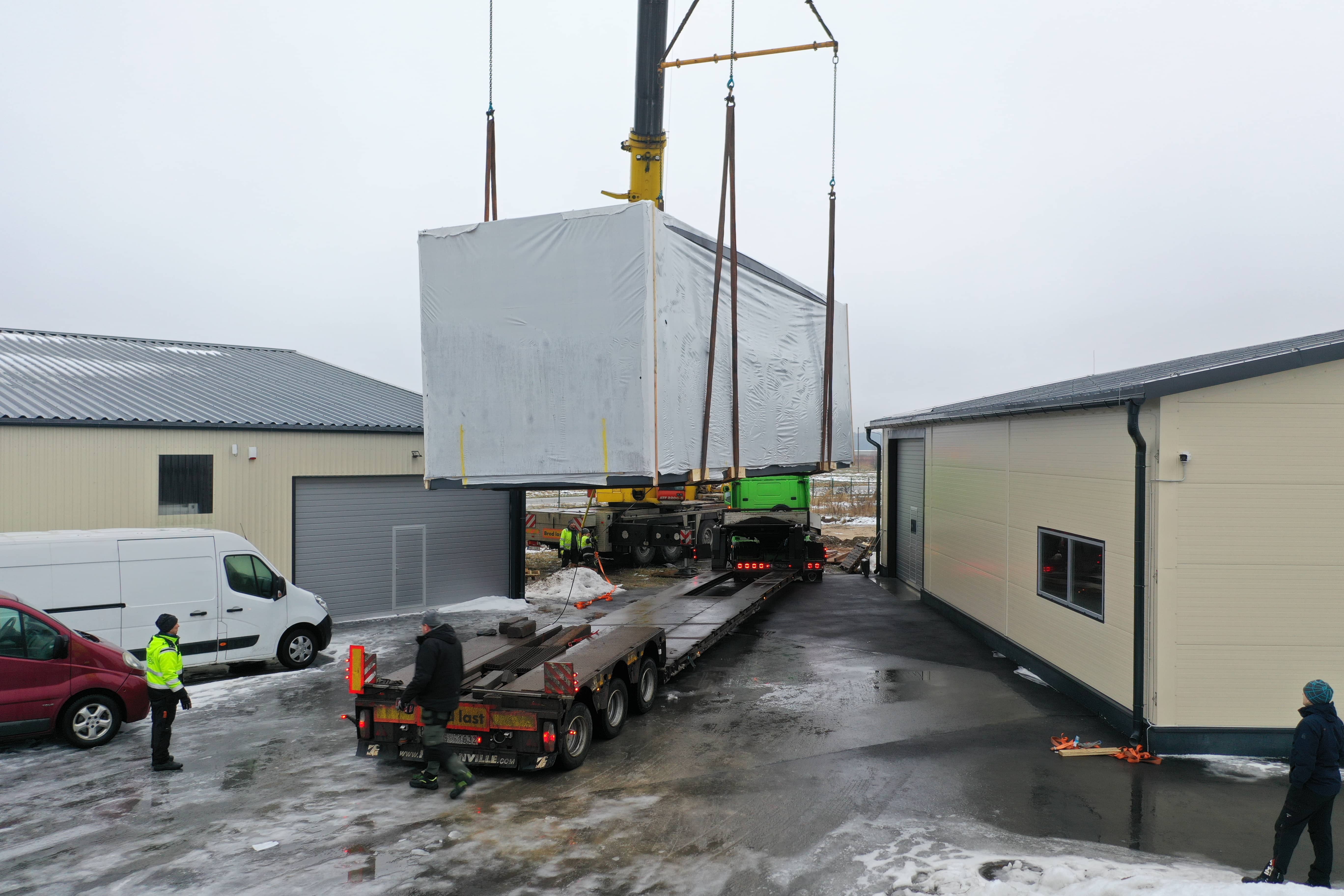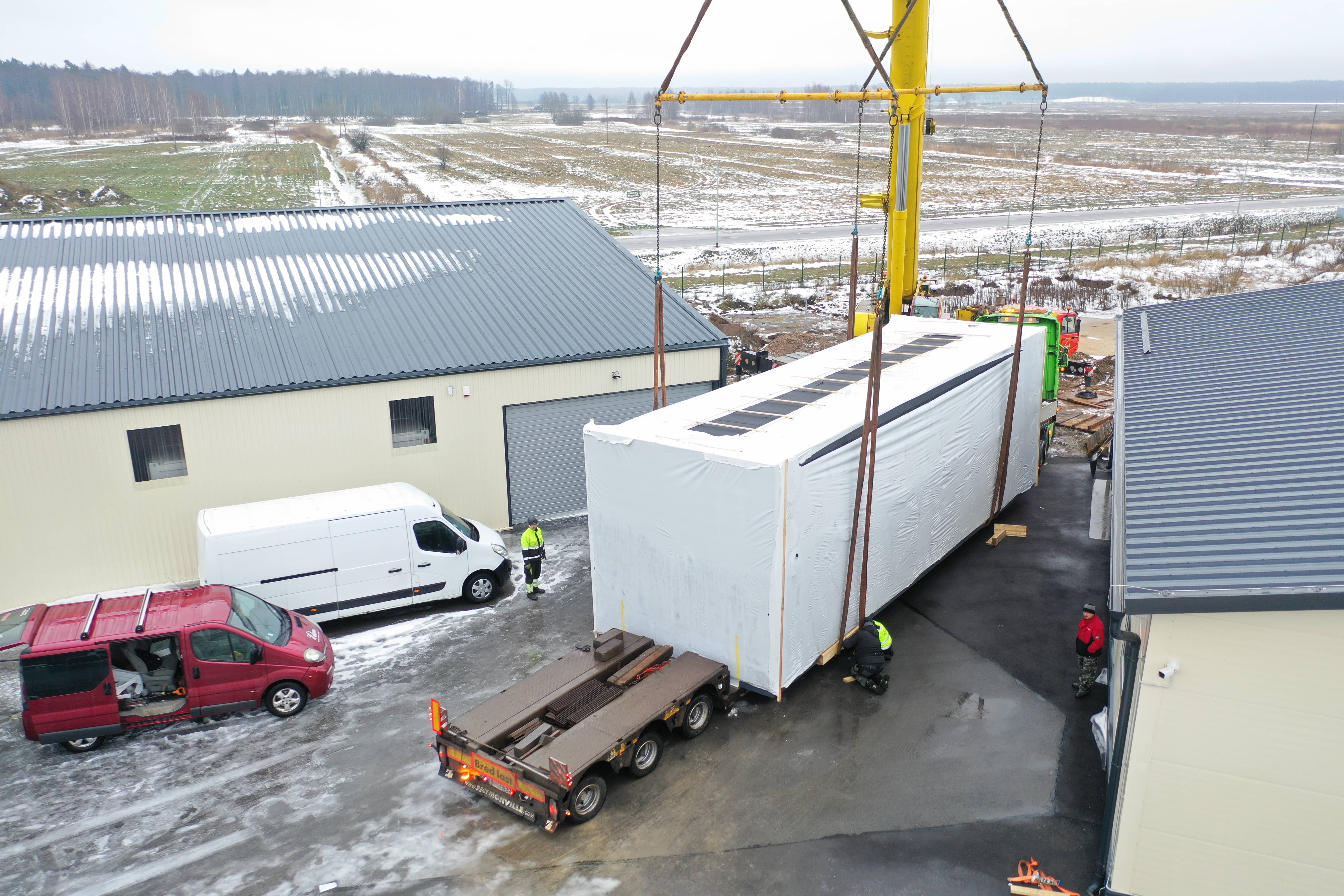 Moduļu mājas transportēšanai tika izmantota atvērtā tipa kravas platforma. Ēkas novietošanu uz platformas un uz iepriekš sagatavotiem stabveida pamatiem veica ar autoceltni.