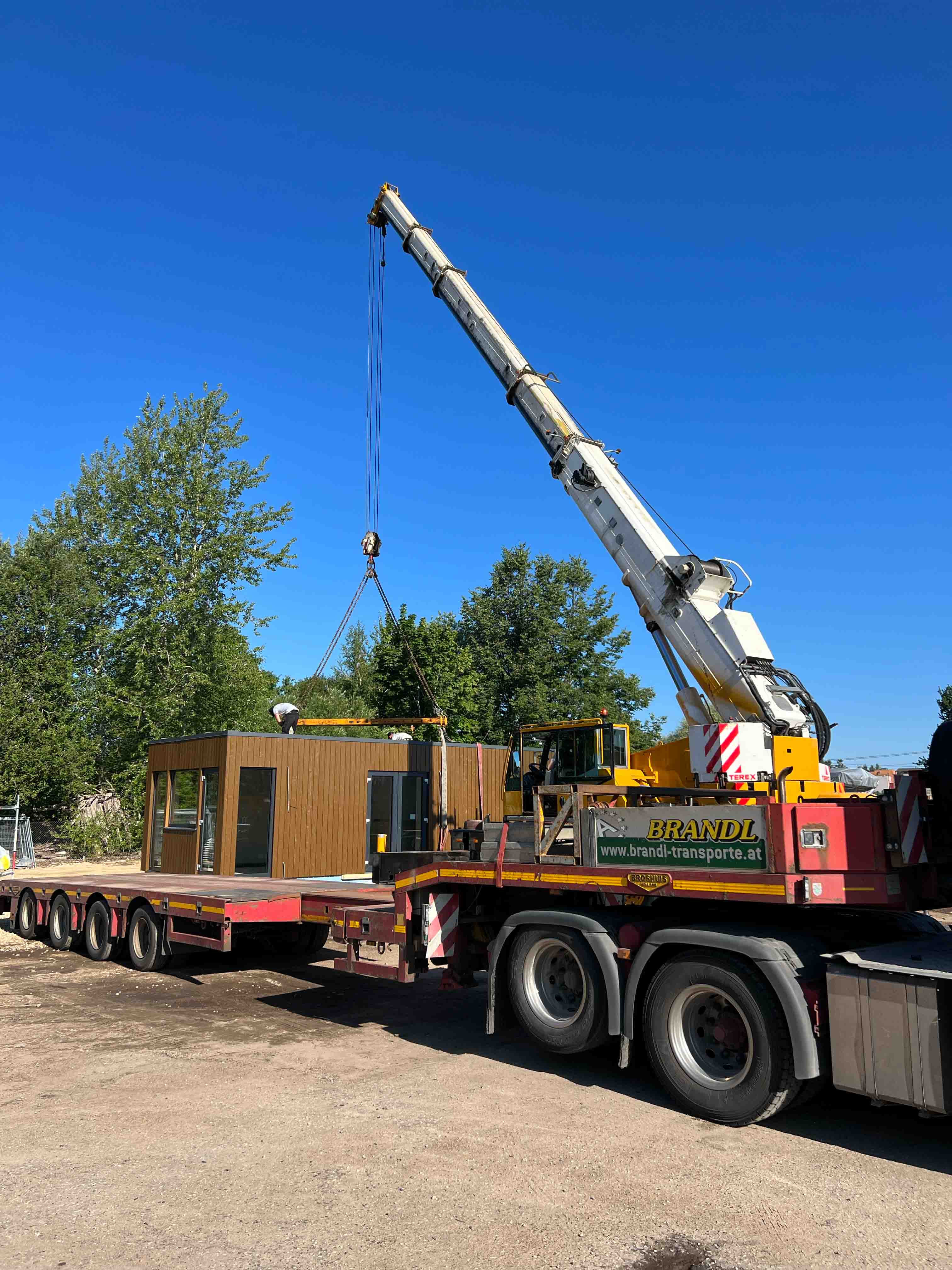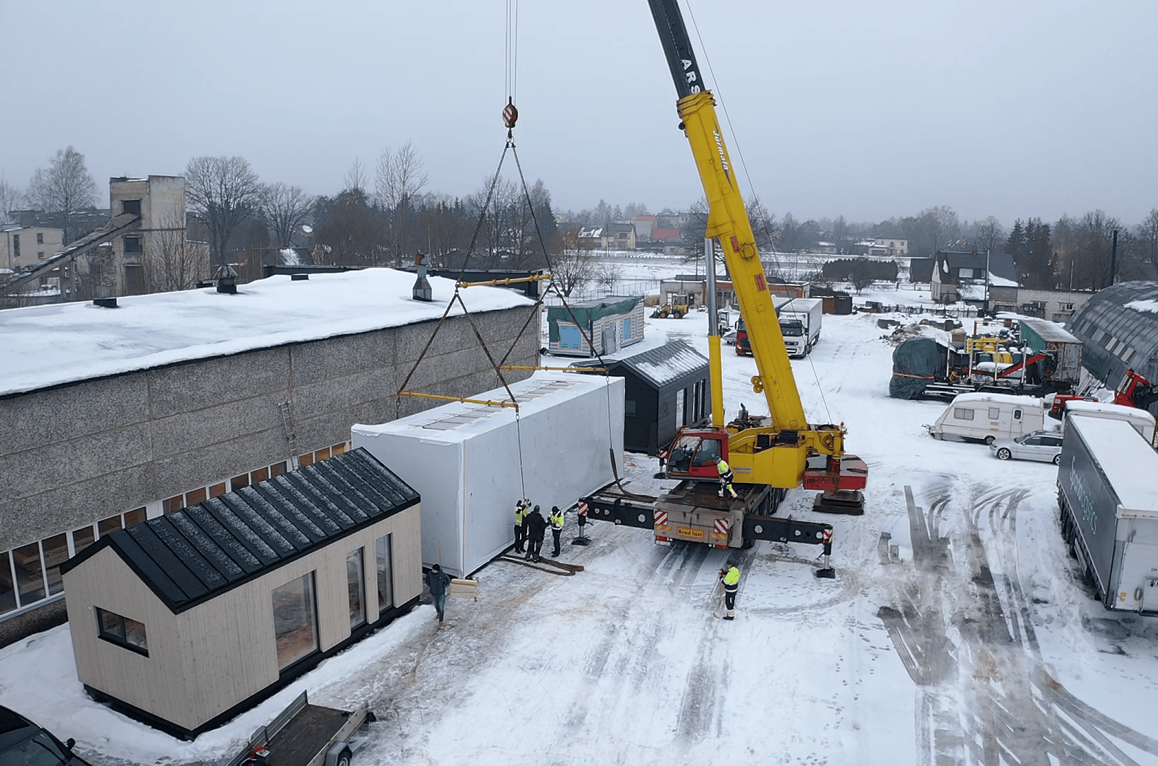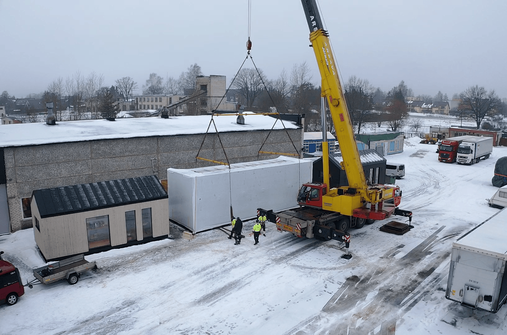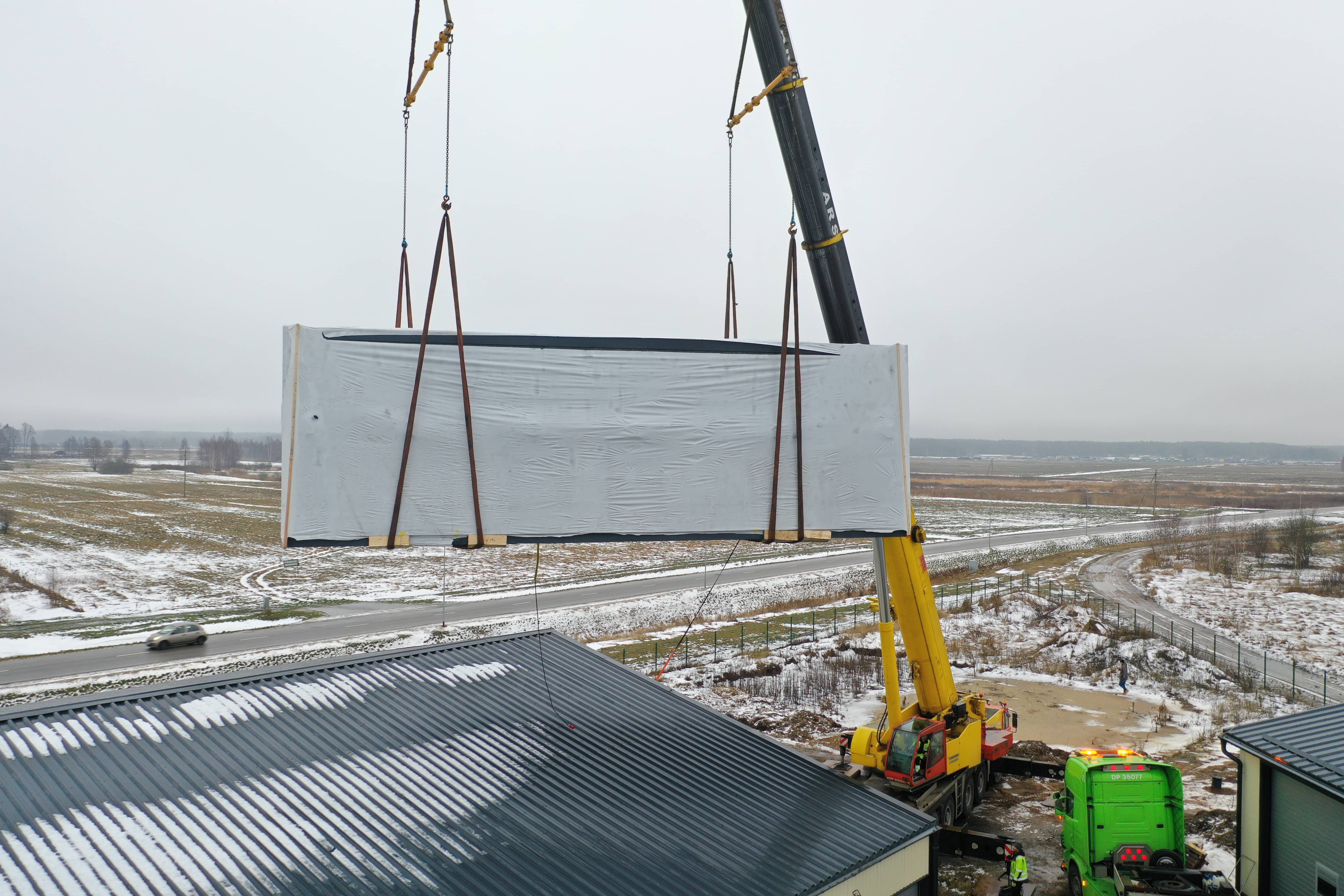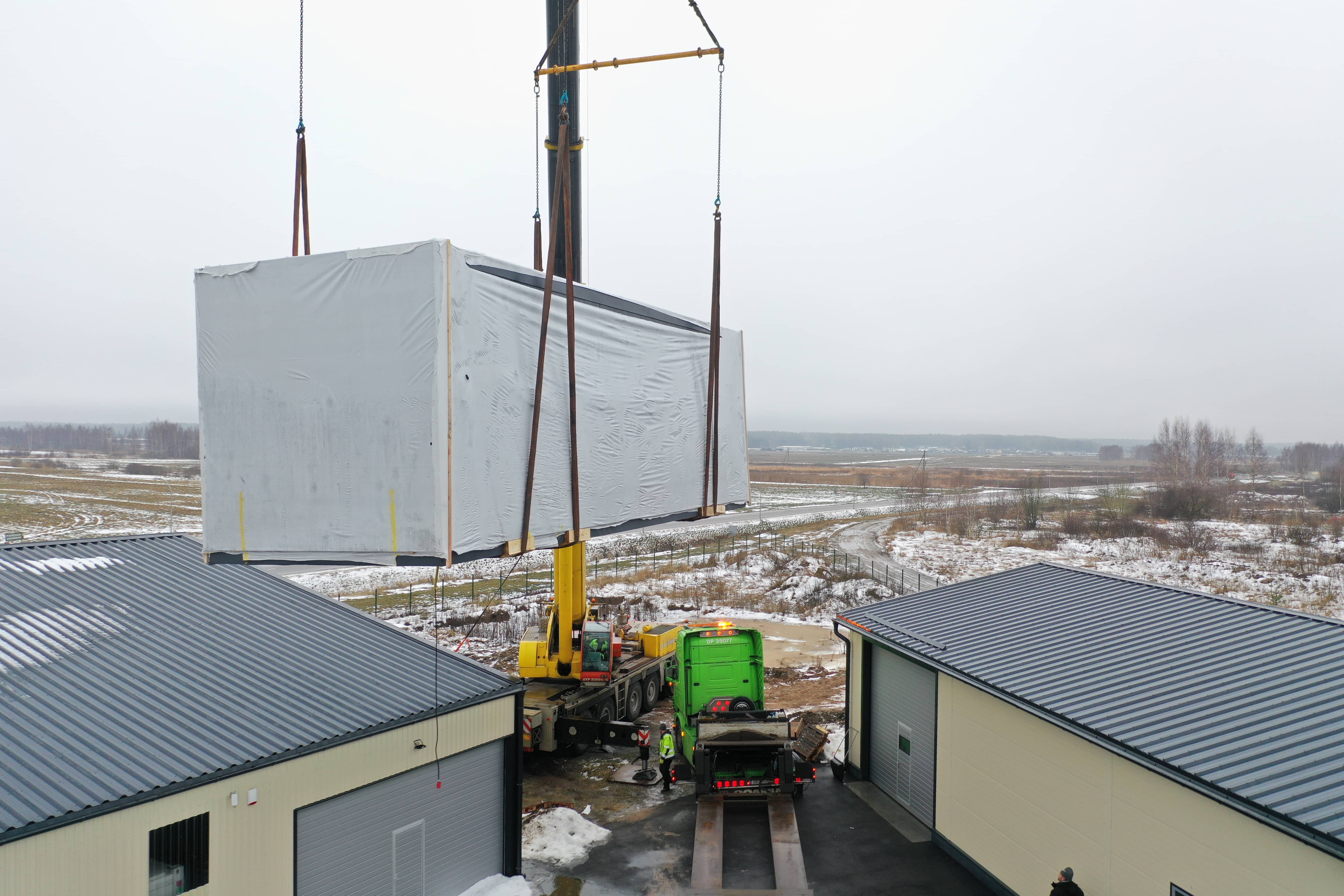 Moduļu mājas transportēšanai tika izmantota atvērtā tipa kravas platforma. Ēkas novietošanu uz platformas un uz iepriekš sagatavotiem stabveida pamatiem veica ar autoceltni.